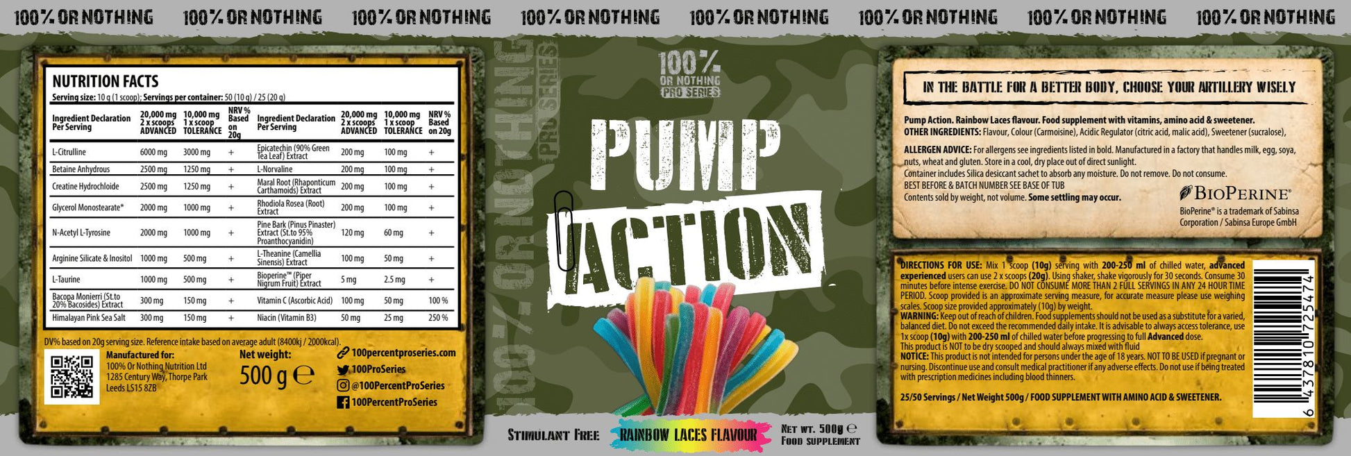Introducing Pump Action! Delivering a massive clinical dose of pump swelling ingredients for increased blood flow. Add in Glycerol for enhanced cellular hydration, with supporting nutrients & ingredients designed for potentiating endurance, to give you the ultimate stimulant free Pre Workout.